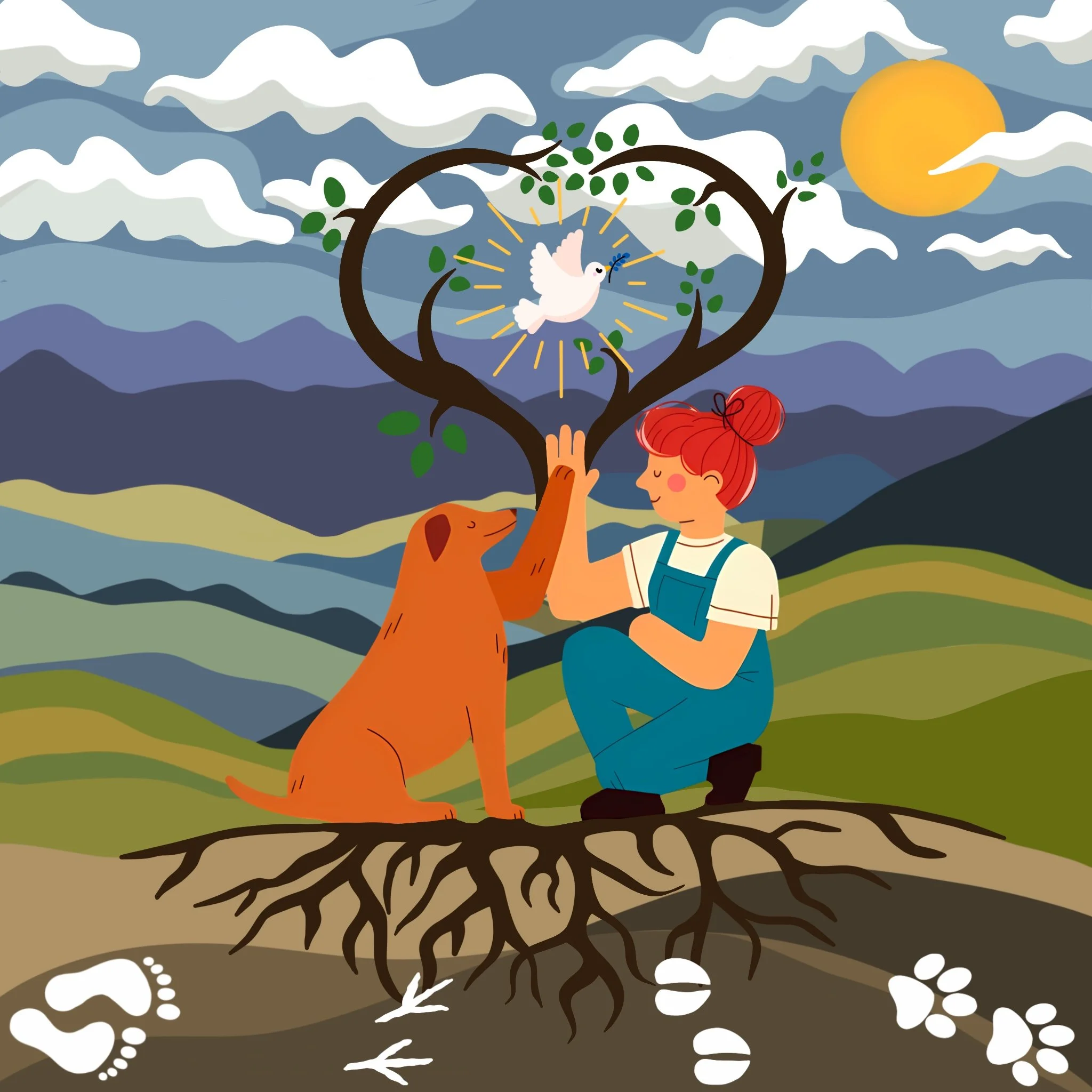 The logo you see — a woman and her dog meeting hand to paw beneath a heart-shaped tree — captures what this place stands for: partnership, peace, and purpose. The roots beneath remind us that what’s nurtured with love becomes something lasting, and the dove above reminds us that true care creates freedom, not restraint.
